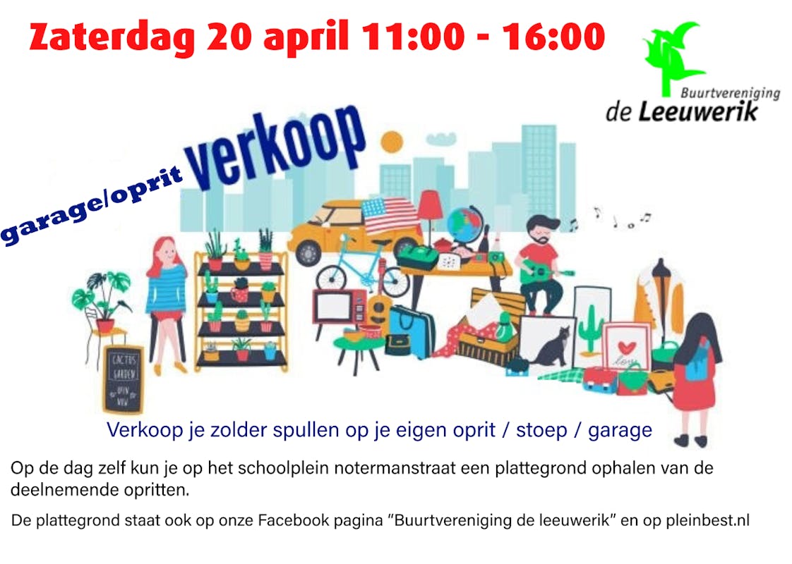 Zaterdag 20 april organiseert de buurtvereniging van de leeuwerik in Best een oprit / garage sale. Door de hele wijk zullen mensen aan huis hun spullen tekoop aanbieden.