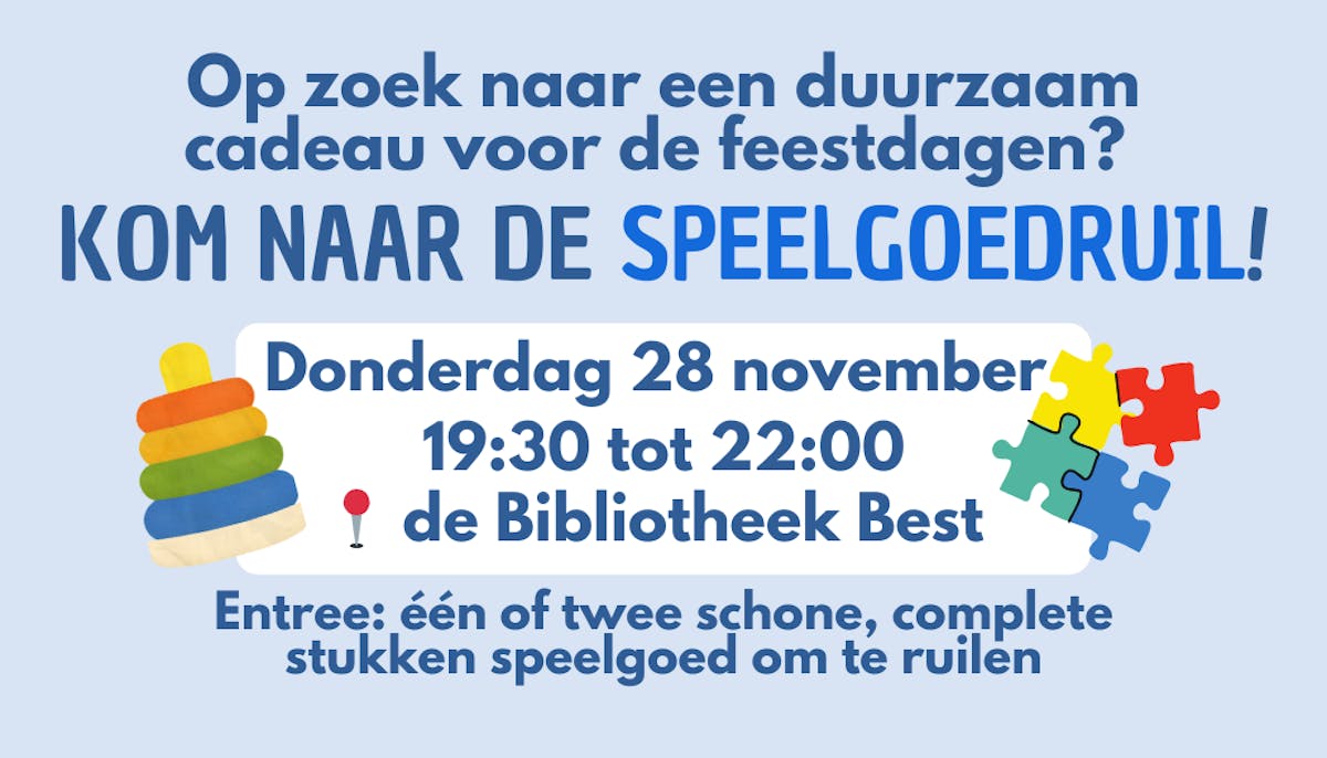 De feestdagen komen er weer aan. Daar hoort natuurlijk het geven en krijgen van cadeautjes bij. Maar waarom zou de Sint elk jaar nieuw speelgoed kopen, als er al zoveel mooi speelgoed is? Daarom organiseren de Bibliotheek Best en Klimaatburgemeester van Best samen een speelgoedruil. Heb je nog speelgoed liggen wat thuis ligt te verstoffen, maar nog wel een ronde mee kan? Geef het een tweede leven en ruil het met een stuk speelgoed van iemand anders. Daarmee maak je de ander, je portemonnee én de planeet blij!