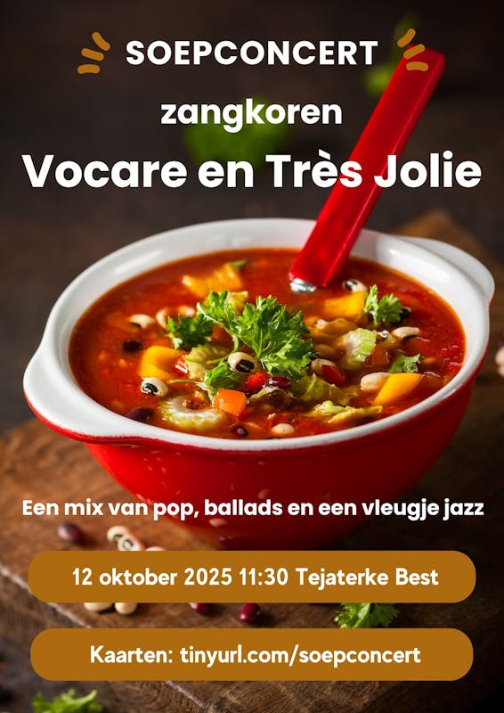 Zanggroepen Vocare en Très Jolie geven samen op 12 oktober 2025 een onvergetelijk soepconcert in het Tejaterke in Best onder de inspirerende leiding van Mirjam Fitters. Zij stellen zich graag aan jullie voor.