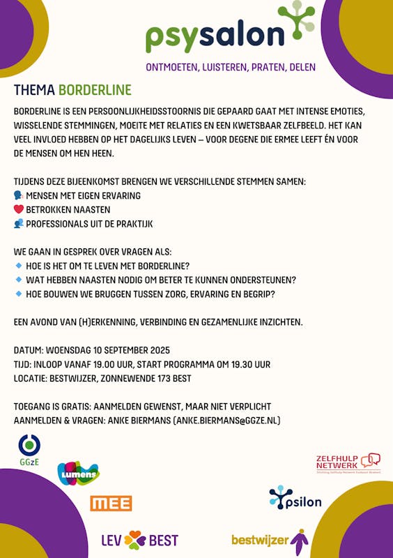 Op woensdag 10 september 2025 is er bij Bestwijzer een Psysalon avond over borderline. Borderline is een persoonlijkheidsstoornis die gepaard gaat met intense emoties, wisselende stemmingen, moeite met relaties en een kwetsbaar zelfbeeld. Het kan veel invloed hebben op het dagelijks leven, voor degene die ermee leeft én voor de mensen om hen heen.