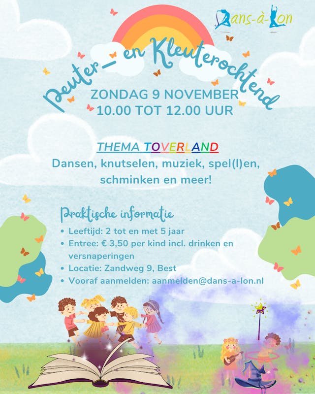 Kinderen van 2 t/m 5 jaar kunnen zich samen met hun ouders heerlijk uitleven met dans, muziek, knutselen, schminken en spelletjes. Het wordt een vrolijke, speelse ochtend vol fantasie, kleur en plezier – perfect voor nieuwsgierige peuters en kleuters die graag bewegen en ontdekken.