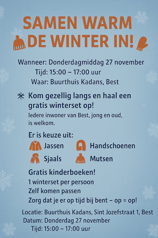 De gemeente Best organiseert samen met de LEV-groep een gezellige winteractie in Buurthuis Kadans. Op donderdag 27 november, van 15.00 tot 17.00 uur, ben je van harte welkom om gratis een fijne winters set op te komen halen.