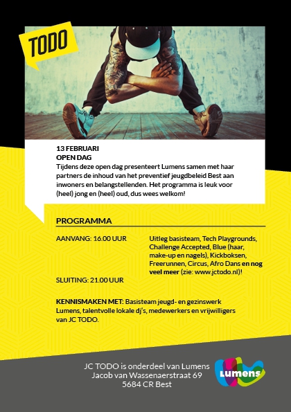 Kom je ook naar de open dag? Lumens presenteert tijdens deze open dag samen met haar partners het preventief jeugdbeleid. Dat doen we o.a. door allerlei demo's en workshops te laten zien en zijn we aanwezig om allerlei vragen te beantwoorden. Zo kun je kennis komen maken met ons en de activiteiten die je in JC TODO kunt verwachten.