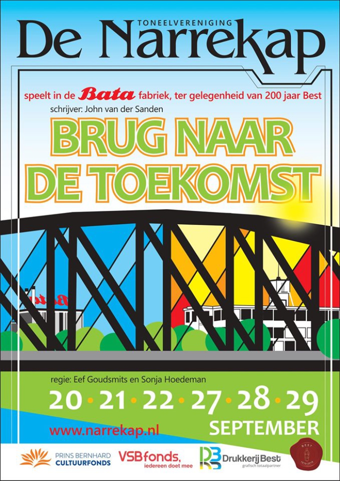 Dit is één van de vele scenes, die de spelers van de Narrekap nu aan het repeteren zijn in 't Tejaterke. Vol overgave doen ze dat. Want het stuk ' Brug naar de toekomst' dat ze ter gelegenheid van '200 jaar Best' spelen in september, moet voor het publiek een echte belevenis worden. Bijzonder is dat de voorstellingen zullen plaatsvinden in een authentieke Batafabriekshal.
