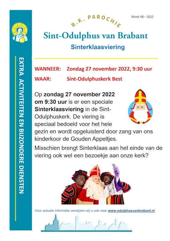 Op zondag 27 november 2022 om 9:30 uur is er een speciale Sinterklaasviering in de Sint-Odulphuskerk. De viering is speciaal bedoeld voor het hele gezin en wordt opgeluisterd door zang van ons kinderkoor de Gouden Appeltjes. Misschien brengt Sinterklaas aan het einde van de viering ook wel een bezoekje aan onze kerk?