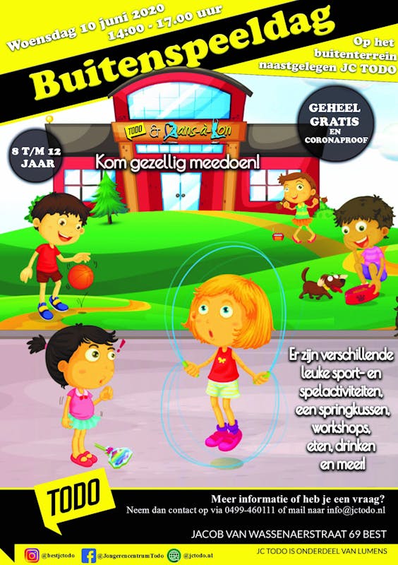 Ook in Best is buitenspelen tijdens de Buitenspeeldag allesbehalve saai en onveilig. Die dag organiseert Todo tussen 14.00 en 17.00 uur toffe activiteiten. Het buitenterrein aan de Jacob van Wassenaerstraat wordt omgetoverd tot een prachtig speelterrein zodat zoveel mogelijk kinderen uit Best onbezorgd kunnen spelen. Want buitenspelen is gezond en leuk! Er zijn verschillende sport- en spelactiviteiten en workshops, er komt een springkussen, er zijn gezonde snacks en drinken te verkrijgen. En dat alles geheel gratis! Uiteraard wordt er gewerkt volgens de richtlijnen van het RIVM.