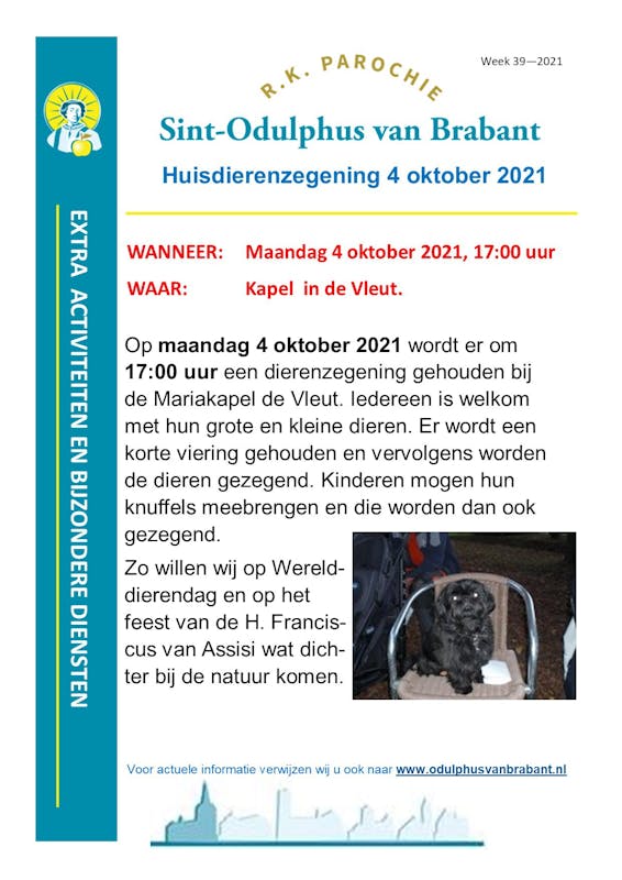 Op maandag 4 oktober 2021 wordt er om 17:00 uur een dierenzegening gehouden bij de Mariakapel de Vleut. Iedereen is welkom met hun grote en kleine dieren. Er wordt een korte viering gehouden en vervolgens worden de dieren gezegend. Kinderen mogen hun knuffels meebrengen en die worden dan ook gezegend.