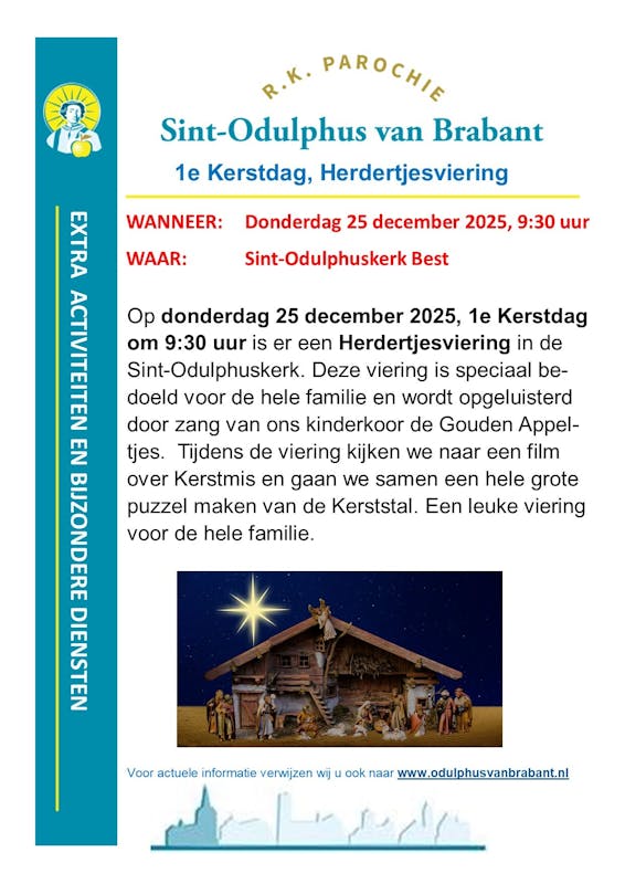 Op donderdag 25 december 2025, 1e Kerstdag om 9:30 uur is er een Herdertjesviering in de Sint-Odulphuskerk. Deze viering is speciaal bedoeld voor de hele familie en wordt opgeluisterd door zang van ons kinderkoor de Gouden Appeltjes.  Tijdens de viering kijken we naar een film over Kerstmis en gaan we samen een hele grote puzzel maken van de Kerststal. Een leuke viering voor de hele familie.