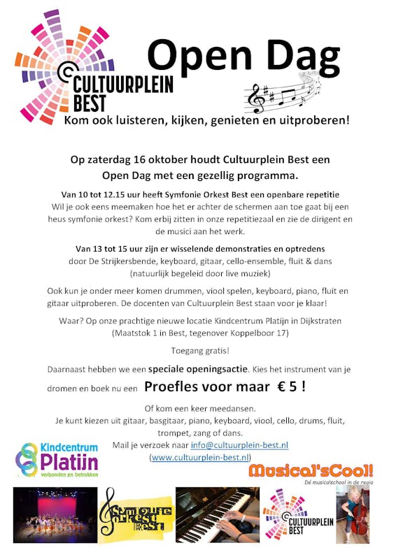 Op zaterdag 16 oktober houdt Cultuurplein Best een Open Dag met een gezellig programma.