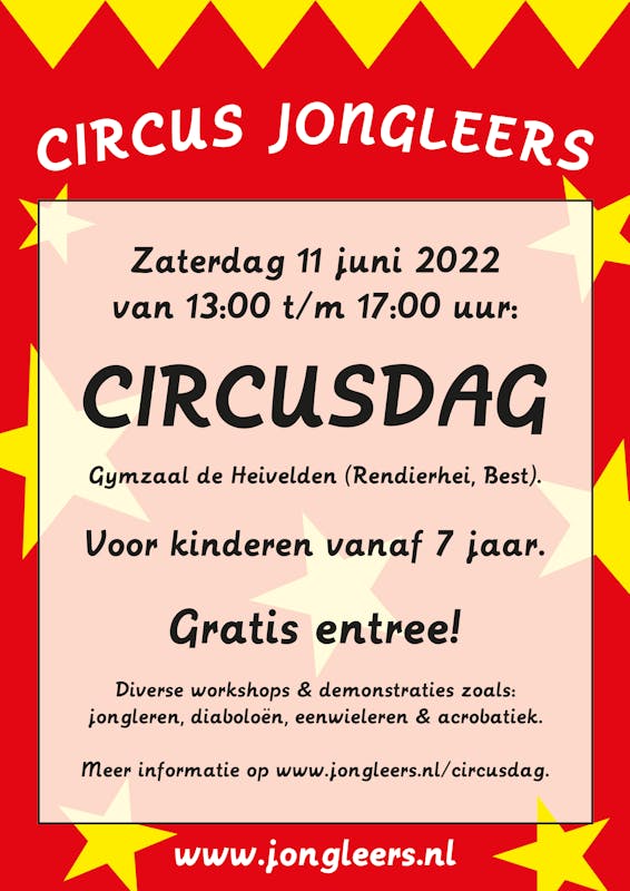 Op zaterdag 11 juni houd Circus Jongleers een Circusdag voor kinderen en jongeren vanaf 7 jaar. De dag vindt van 13:00 t/m 17:00 uur plaats in Gymzaal de Heivelden (Rendierhei in Best).