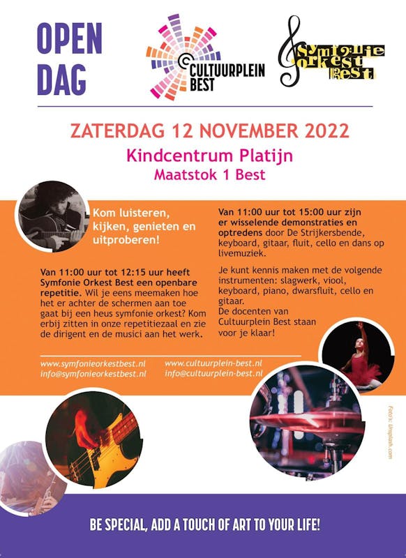 Op zaterdag 12 november vindt de open dag plaats van dans- & muziekcollectief Cultuurplein Best bij Kindcentrum Platijn, Maatstok 1 in Best. Tevens is het van 11:00 tot 12:15 uur openbare repetitie van Symfonieorkest Best. Verder zijn er wisselende optredens van de strijkersbende, dansgroepen, een gitaarensemble, diverse leerlingen op fluit, viool, cello en piano en om 14:30 een preview van de theatershow van Tim's Music. Daarnaast is er volop mogelijkheid om diverse instrumenten uit te proberen en informatie te krijgen van de aanwezige docenten.
