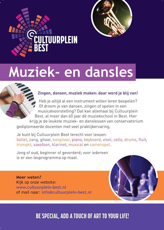 Cultuurplein Best is een docentencollectief dat leuke, leerzame en kwalitatieve muziek- en danslessen aanbiedt in Best.Je kunt kiezen uit......
