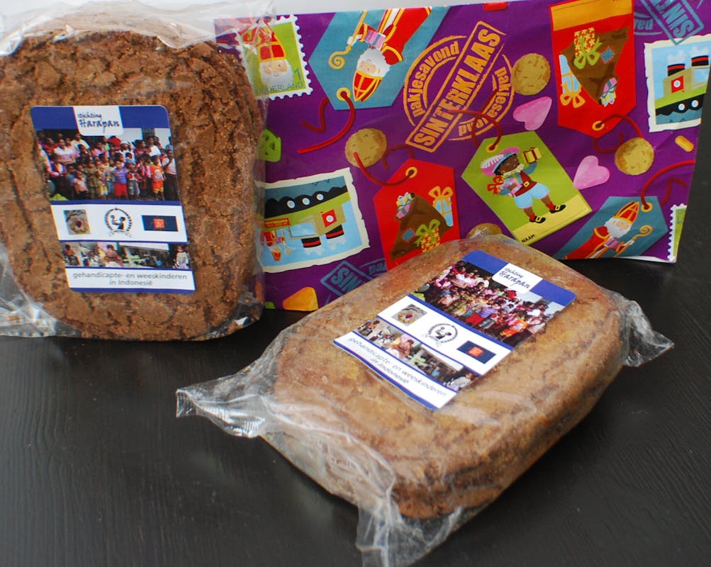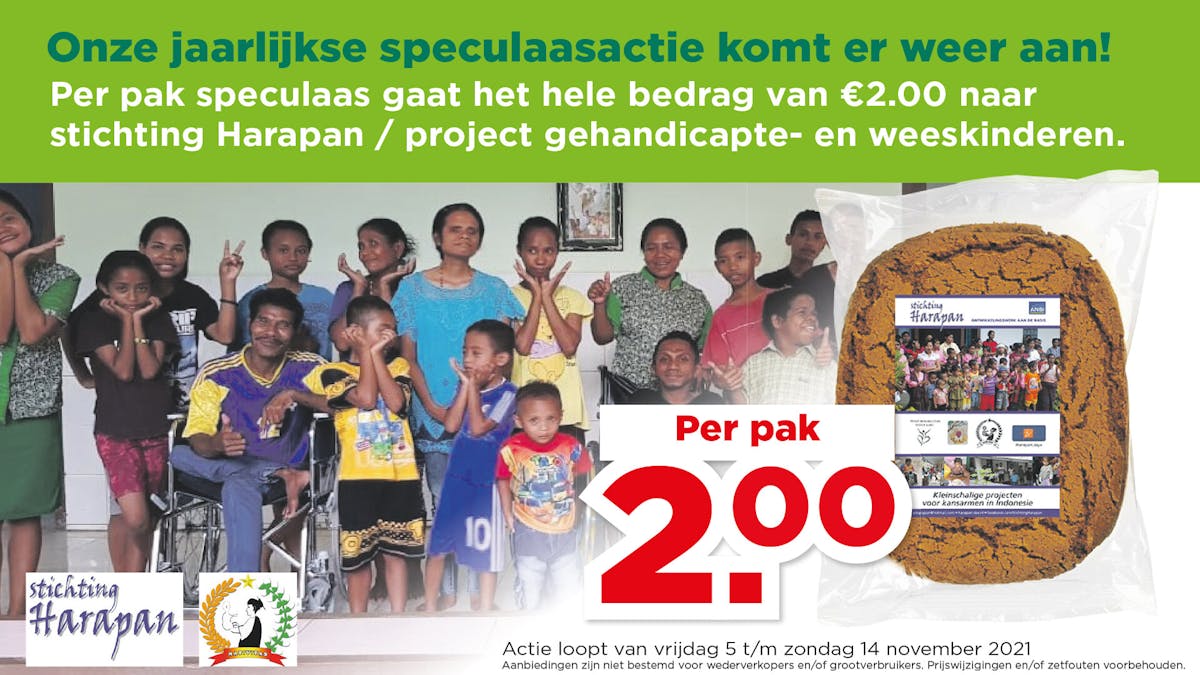 Theo Bressers, medewerker van werkatelier EEHT verkocht een pak speculaas aan mede oprichter en oud bestuurslid Joz Bruggeman . Daarmee is donderdag de 11e speculaasactie officieel gestart. De opbrengst wordt volledig bestemd voor de kindertehuizen van Nativitas op Flores. Theo Bressers en Mathijs van Emmen van werkatelier EEHT (bij de molen) hebben voor het grootste gedeelte de 3000 pakken speculaas voorzien van een sticker. Ook pakken zij de cadeautasjes (een samenwerkingsproject Harapan met EEHT) in. In zo'n tasje zitten 1 pak speculaas en een doosje met diverse soorten thee, een belangrijk product in de werkplaats waar mensen met afstand tot de arbeidsmarkt werkzaam zijn. Een cadeautasje kost € 6,--.