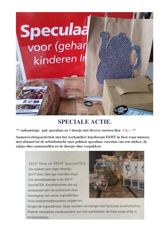 Het is een samenwerkingsactiviteit met het werkatelier/ lunchroom EEHT in Best waar mensen met afstand tot de arbeidsmarkt onze pakken speculaas voorzien van een sticker en de doosjes thee verpakken. EEN CADEAUTASJE KOST € 6,--