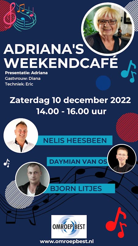 Zaterdag 10 december van 14.00 - 16.00 uur een muzikale uitzending van Adriana's weekendcafé. Luister o.a. naar Nelis, Daymian en Bjorn.