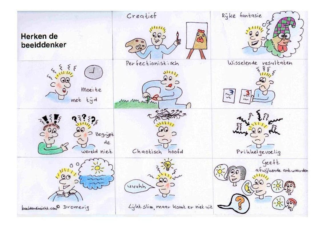 Alles speelt zich driedimensionaal in het hoofd af en de oren blijven als informatiebron achter bij de ogen. Luisteren is dan ook nooit de sterkste kant. Dit is echter geen onwil, maar onmacht. Beelddenken wordt weleens een ‘lastige gave’ genoemd. Lastig omdat het voor leerproblemen kan zorgen op school. Een gave omdat het zich kan uiten in creativiteit, talenten op het gebied van inzichtelijk en ruimtelijk denken, humor en muzikaliteit.