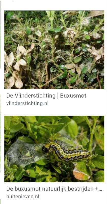 Helaas hij is er weer, de buxusmot. Heeft jou buxus van die plekjes net als op de bovenste foto? Dan zitten er hele kleine rupsjes onder je blaadjes ze op te eten, foto onder.