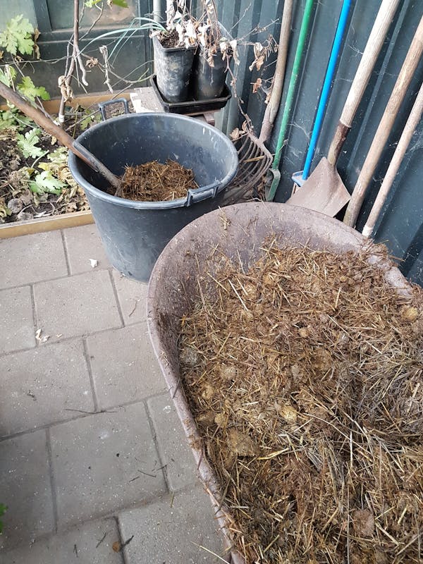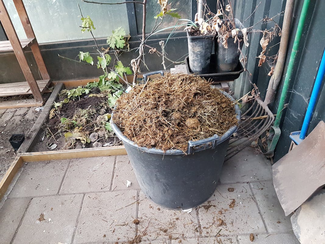 Om dat te doen ga ik een experiment uitvoeren. Ik ga namelijk een bak met verse paardenmest composteren in de kas. De warmte van dat proces zou ... theoretisch, de kas vorstvrij moeten kunnen houden.
