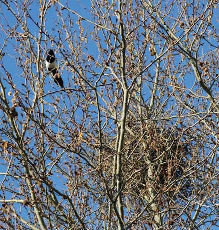 Een stelletje eksters is druk in de weer met de bouw van een nest in een plataan langs de vrije busbaan in de wijk Heivelden.
