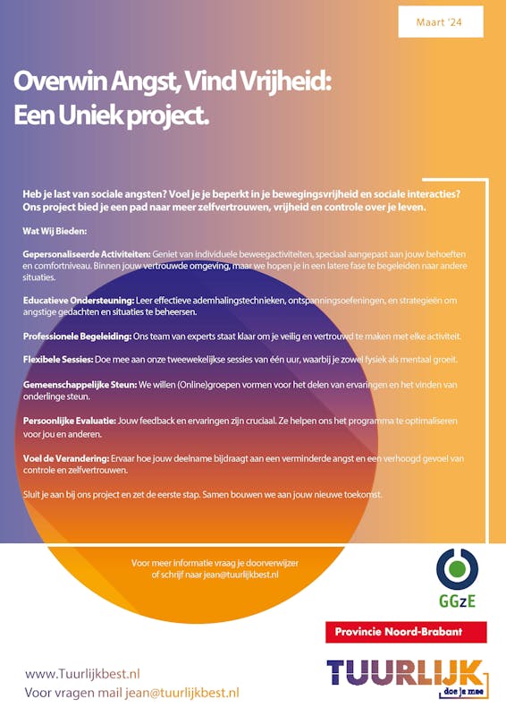 Kent u iemand in uw omgeving die baat kan hebben bij dit traject? Moedig hen aan om deel te nemen aan deze transformatieve reis. Samen zetten we stappen naar een toekomst waarin angst niet langer de overhand heeft. Sluit u aan bij dit bijzondere project en help ons een verschil te maken in het leven van de deelnemers.
