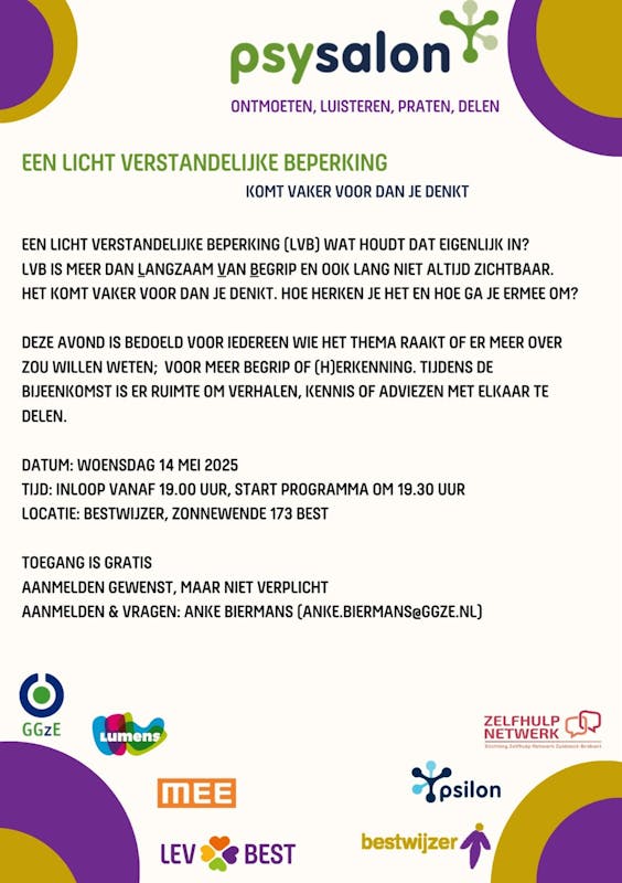 Ontmoet, luister, deel en praat mee tijdens de Psysalon op woensdag 14 mei, over leven met een licht verstandelijke beperking. Een plek waarbij ontmoeting en dialoog centraal staan, bedoeld voor iedereen die geïnteresseerd is in of geraakt wordt door dit thema. Je bent van harte welkom!😊