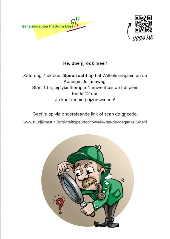 Schrijf je in voor de leuke speurtocht op 7 oktober. Je kunt ook de qr code scannen op de bijgevoegde poster.