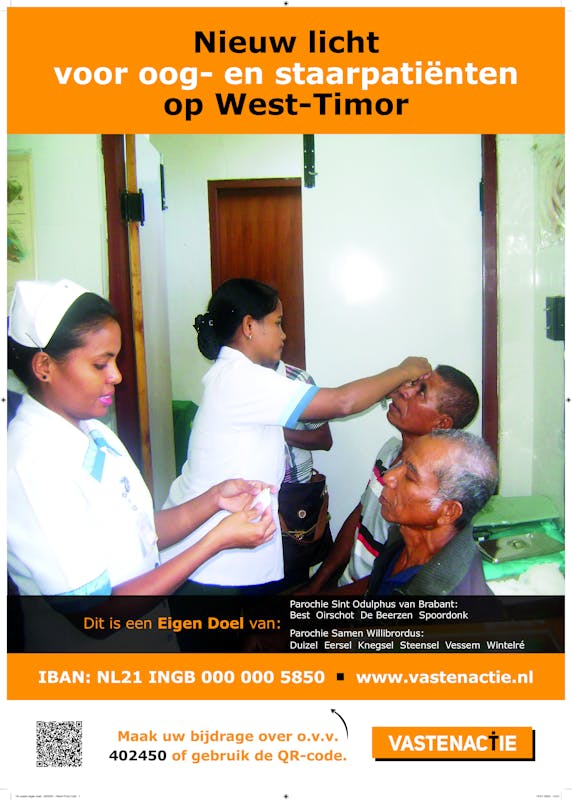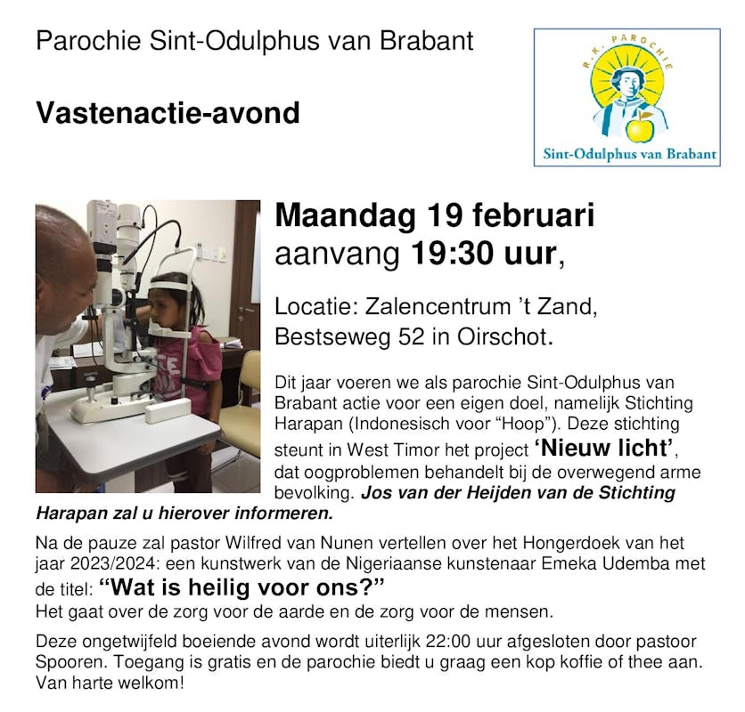 De opbrengst van de VASTENACTIE 2024 in de parochies Sint-Odulphus van Brabant (de Beerzen, Oirschot en Best) en Samen Willibrordus (Eersel, Duizel, Steensel, Knegsel, Vessem, Wintelre) wordt dit jaar bestemd voor het Harapan project in samenwerking met het revalidatiecentrum Hidup Baru: NIEUW LICHT, voor oog- en staaroperaties op West-Timor. U bent van harte uitgenodigd om op maandag 19 februari a.s. naar zalencentrum 't Zand in Oirschot te komen om meer te horen over de VASTENACTIE 2024.