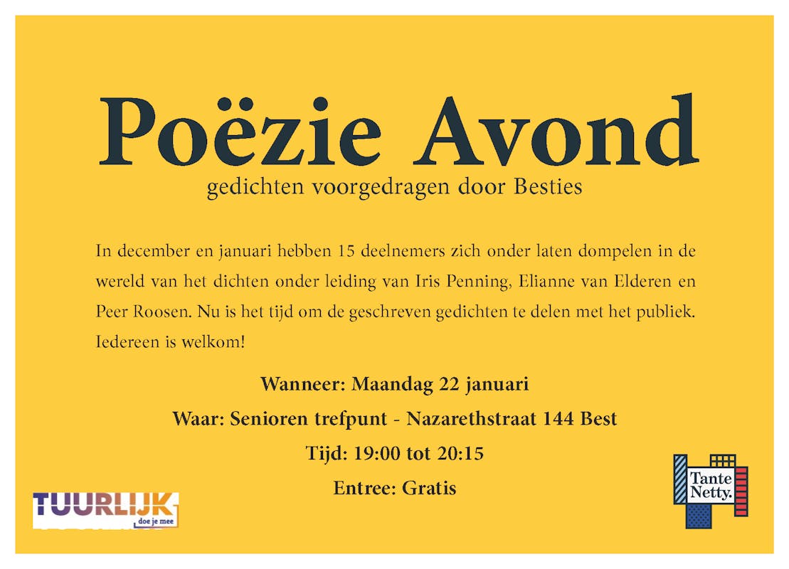 In december en januari zijn er onder leiding van Social designcollectief Tante Netty zes poëzieworkshops georganiseerd. Dit op initiatief van het Tuurlijk cultuurteam van de Gemeente Best. De workshops zijn gegeven door dichters Iris Penning, stadsdichter van Eindhoven en Elianne van Elderen. Elianne is geboren in Best en laat zich graag inspireren door haar geboortedorp.