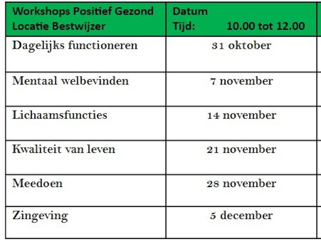 Je kunt zelf kiezen aan welke en hoeveel workshops je deelneemt, er zijn geen kosten aan verbonden. De data per workshop zie je op de bijgevoegde foto. De workshops worden gegeven door Wilma Hartman in samenwerking met een collega van Bestwijzer.