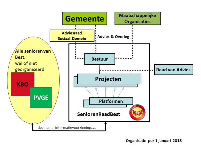 Onderstaand plaatje geeft de organisatiestructuur weer van de SeniorenRaadBest en haar relatie met initiërende organisaties en externe partijen.