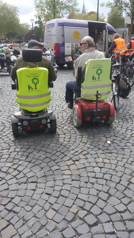 Tijdens de tocht heeft iedereen een goed zichtbaar veiligheidshesje aan en er rijden minstens 3 begeleiders per groep met de fiets mee die de route kennen en zorgen dat ze veilig kunnen oversteken, helpen en ondersteunen met lopen naar de pauzeplek en naar het invalidetoilet.
